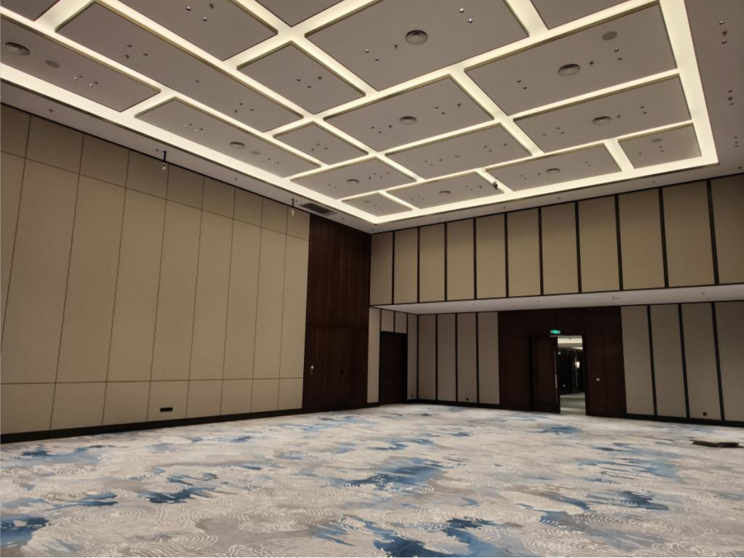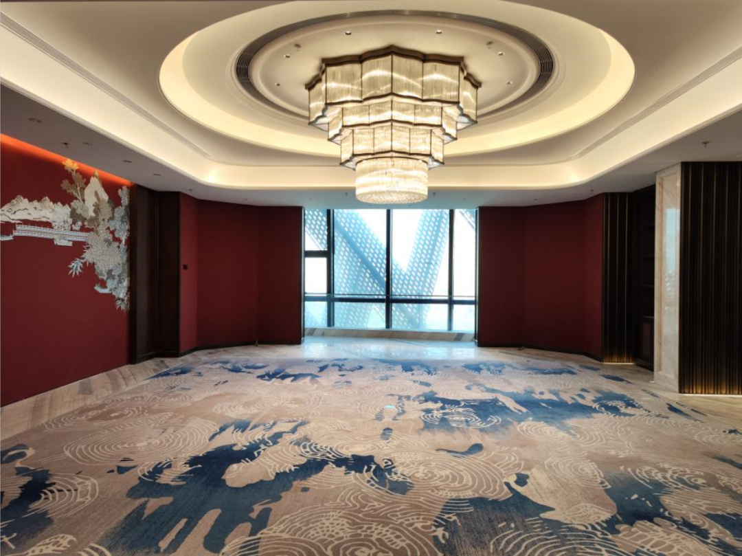 酒店大堂和過廳吊頂為異型鋁型材格柵吊頂,大宴會廳吊頂為多層鋁方通交錯布置造型,項目團隊使用BIM建模技術(shù),優(yōu)化施工工藝提高了施工效率,僅此一項節(jié)省工期30天,項目團隊群策群力科學(xué)組織各項施工,7天完成地毯鋪裝18000平方米,10天完成墻面硬包安裝20000平方米,40天完成大理石鋪貼和干掛施工3.4萬平方米,項目如期通過驗收,為酒店開業(yè)奠定堅實的基礎(chǔ)。