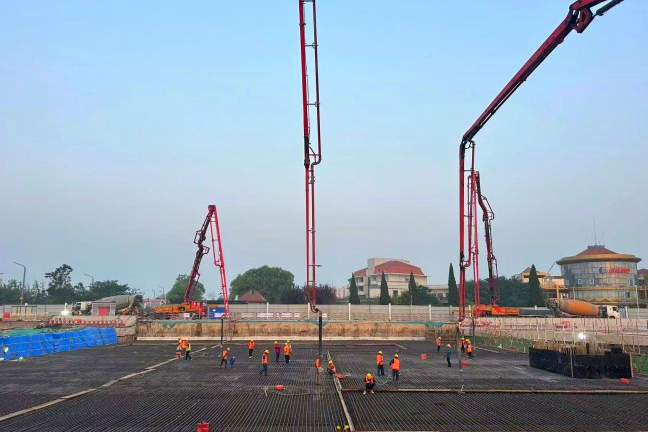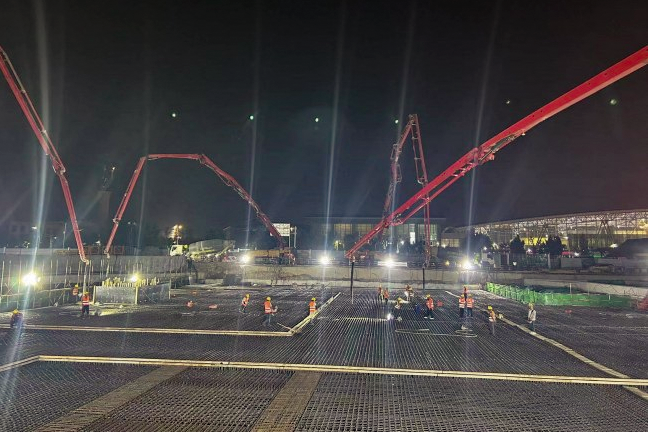 本次澆筑從9月6日22時(shí)開始,歷時(shí)30小時(shí),4臺泵車聯(lián)合作戰(zhàn),順利澆筑完成3800立方米混凝土。為完成施工區(qū)域道路導(dǎo)改及管線遷改,臨八路人防頂板先行施工,人防蓋板由鋼管柱支撐,長度49米,寬度73.5米,蓋板下主體結(jié)構(gòu)及土方施工采用蓋挖法施工,結(jié)構(gòu)主體采用C45P8抗?jié)B混凝土。