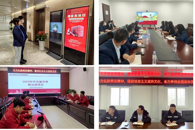 活動(dòng)期間,集團(tuán)在宣傳平臺(tái)開設(shè)“法治小課堂”欄目,推送《國家憲法日| 憲法和你的一生有什么關(guān)系?》《憲法宣傳周│“憲法知識(shí)知多少”專題測試》《憲法宣傳周│習(xí)近平法治思想應(yīng)知應(yīng)會(huì)(上)》《憲法宣傳周│習(xí)近平法治思想應(yīng)知應(yīng)會(huì)(下)》《憲法宣傳周│習(xí)近平法治思想專題測試》5篇普法推文,并通過集團(tuán)電子屏投放憲法宣傳海報(bào),營造濃厚活動(dòng)氛圍。同時(shí),集團(tuán)積極組織各部室、子公司積極參與2023年全國 “憲法宣傳周”憲法知識(shí)網(wǎng)上競答活動(dòng),廣泛動(dòng)員各子公司靈活采用線上、線下相結(jié)合的普法形式,大力加強(qiáng)習(xí)近平法治思想與憲法等內(nèi)容的學(xué)習(xí)宣傳。