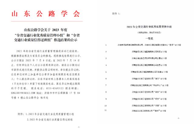 山東公路學(xué)會發(fā)布《山東公路學(xué)會關(guān)于2023年度“全省交通行業(yè)優(yōu)秀質(zhì)量管理小組”和“全省交通行業(yè)質(zhì)量信得過班組”推選結(jié)果的公示》。金曰公司“篤行”“科創(chuàng)中心”“路安”“橋安”“求真”“鵲鳴”6個QC小組成果榮獲一等獎,其他成果另獲二等獎19項、三等獎5項;5個班組獲得“全省交通行業(yè)信得過班組”稱號。