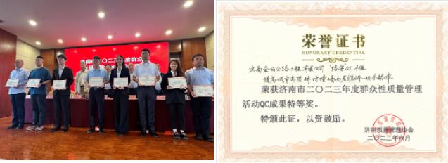 濟南質(zhì)量管理協(xié)會發(fā)布《關(guān)于公布濟南市 2023 年度群眾性質(zhì)量管理活動優(yōu)秀成果、質(zhì)量信得過班組的通知》。金曰公司“路安”QC小組的成果“提高城市高架橋防撞墻面層維修一次合格率”榮評“濟南市2023年度群眾性質(zhì)量管理活動QC成果特等獎”。