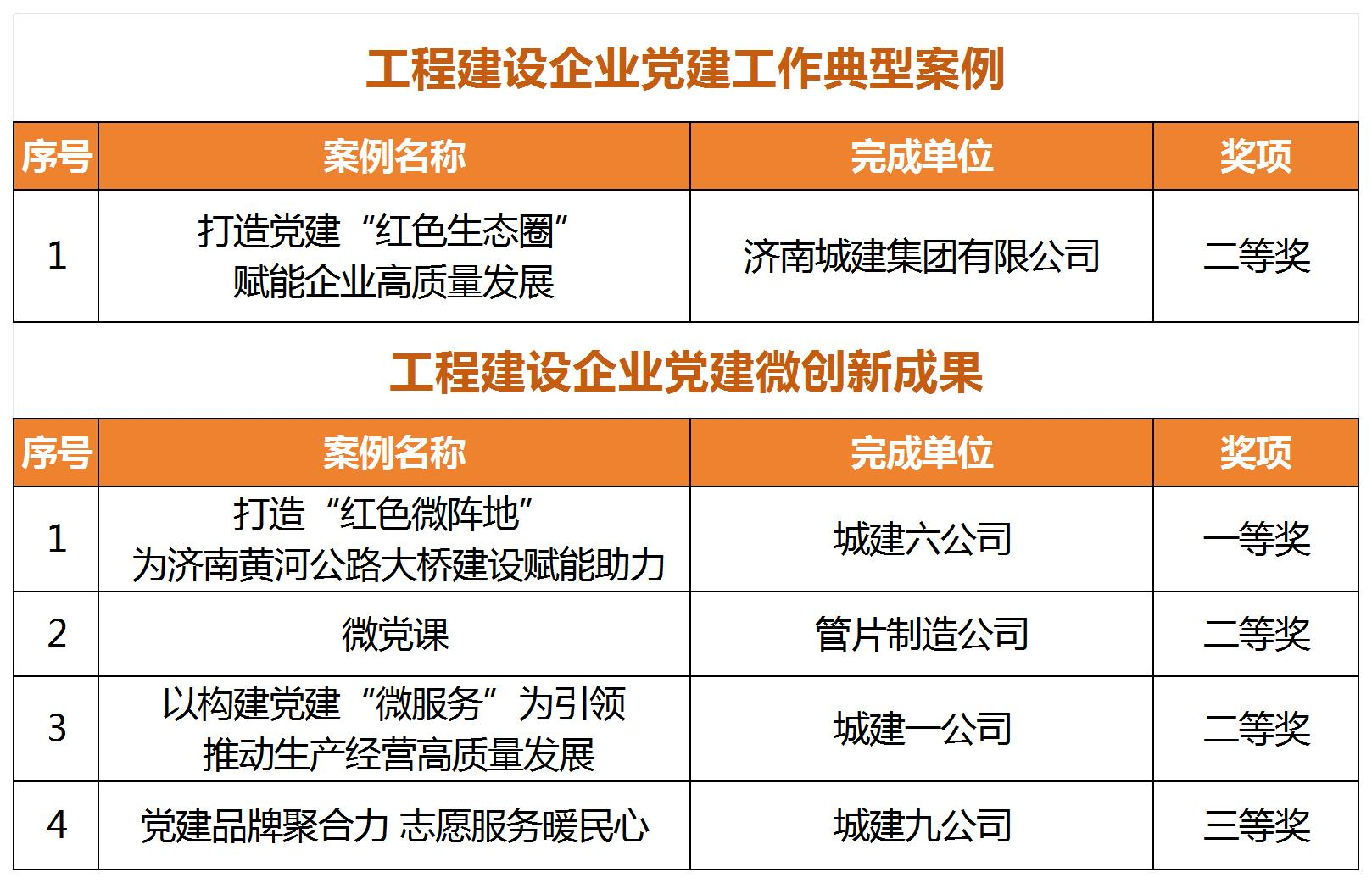 近日,中國(guó)施工企業(yè)管理協(xié)會(huì)發(fā)布了《關(guān)于推廣2024年工程建設(shè)企業(yè)黨建工作優(yōu)秀成果的通知》,建設(shè)集團(tuán)所屬濟(jì)南城建集團(tuán)公司《打造黨建“紅色生態(tài)圈” 賦能企業(yè)高質(zhì)量發(fā)展》黨建工作案例獲評(píng)“工程建設(shè)企業(yè)黨建工作典型案例”二等獎(jiǎng),城建六公司《打造“紅色微陣地 ” 為濟(jì)南黃河公路大橋建設(shè)賦能助力》、城建一公司《以構(gòu)建黨建“微服務(wù)”為引領(lǐng) 推動(dòng)生產(chǎn)經(jīng)營(yíng)高質(zhì)量發(fā)展》等4項(xiàng)案例分別獲評(píng)“工程建設(shè)企業(yè)黨建工作微創(chuàng)新成果”一、二、三等獎(jiǎng)。