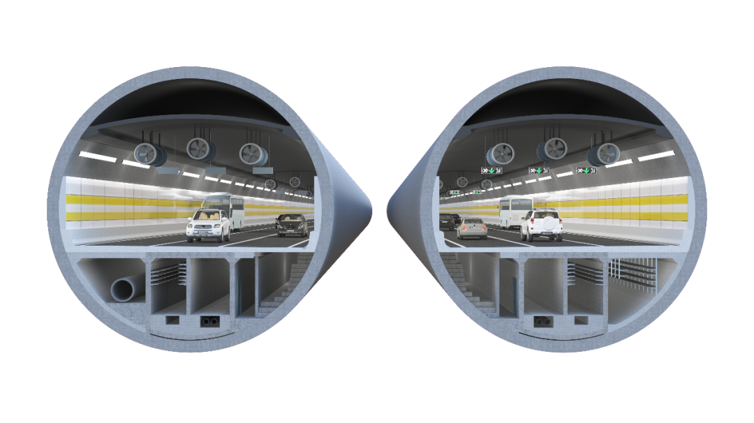 為減少市政管線過黃河成本,充分利用市政隧道下部通道資源搭載穿黃河市政管線,隧道下部預(yù)留穿黃河市政管線艙。同時(shí),盾構(gòu)段采用在車行道路面下設(shè)置逃生疏散樓梯與專用逃生救援通道(縱向逃生救援方案),并結(jié)合工作井設(shè)置車行橫通道、明挖暗埋段設(shè)置人行橫通道的縱向結(jié)合橫向疏散救援的綜合方案,形成可靠高效的疏散救援設(shè)施,確保運(yùn)行安全。