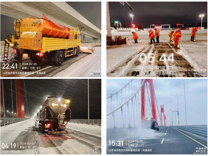 濟南金曰公路工程有限公司承建的國道309、濟南黃河公路大橋、國博城等項目立即啟動應急預案,開啟“機械+人工”的聯(lián)動除雪模式,對交叉路口、車輛密集、人員密集等區(qū)域進行重點清理,雪中除雪效果顯著。截至目前,共計出動應急隊伍150余人,調(diào)配自有和所在轄區(qū)街道辦除雪機械設(shè)備30余臺(套),撒布融雪劑30余噸。全力保障了重要干線道路通暢,確保了周圍居民的安全通行。