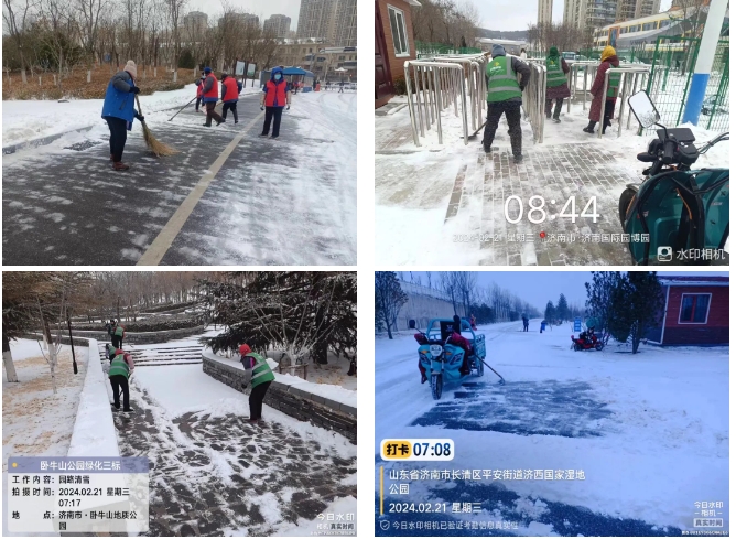 濟南城市建設(shè)集團園區(qū)管理有限公司提前做出預判并發(fā)布相應通知,為惡劣天氣應急管理做好全面準備。華山、濟西濕地、濟南園博園三大景區(qū)及時響應、迅速行動,全力組織開展掃雪除冰工作,利用掃雪車、雪鍬、雪鏟等工具,對景區(qū)內(nèi)各出入口、廣場、道路臺階等重點部位進行清雪、清冰工作并鋪設(shè)相應防滑措施,保障道路暢通與市民游客安全,最大限度減少低溫雨雪天氣影響。