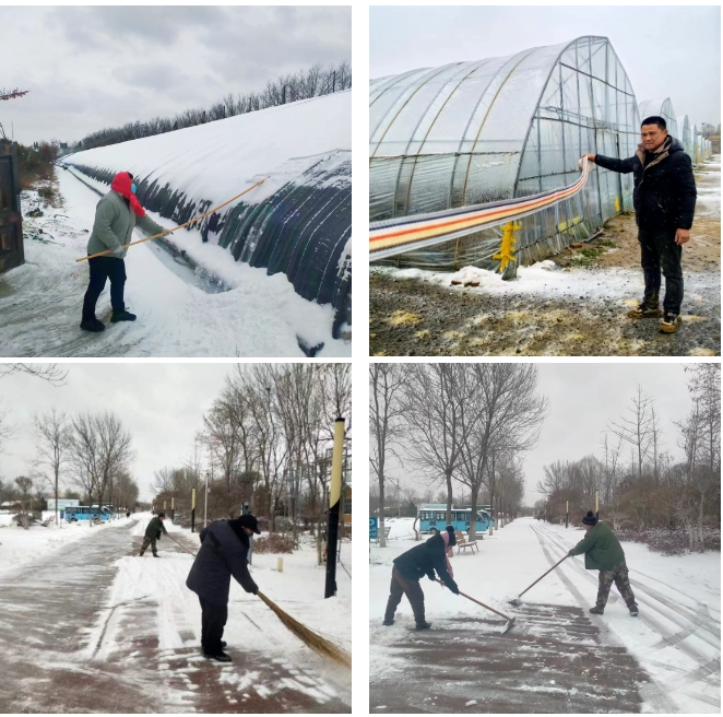 山東濟西濕地生態(tài)農(nóng)場有限公司提前組織人員檢修溫室大棚設(shè)施,保證正常運轉(zhuǎn),同時,加強棚內(nèi)保溫,指導租戶及時關(guān)閉放風口、防風保溫。加強值守和巡查,做到隨下隨清,尤其注意加強夜間除雪,避免積雪或冰層過厚壓塌棚室,及時清理園內(nèi)主次干道積雪,確保道路通暢。