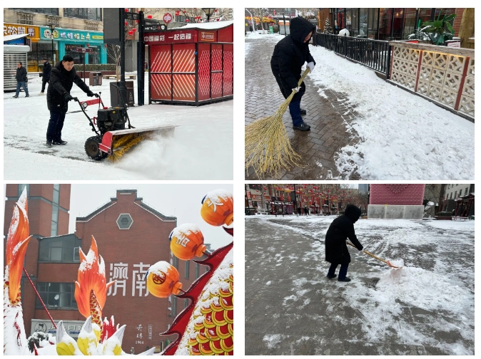 濟南泉世界商業(yè)管理有限公司召集物業(yè)團隊提前對印象濟南·泉世界進行緊急除雪應對部署。根據(jù)特殊天氣情況在商戶群內(nèi)提前下發(fā)溫馨提示,提醒商家大雪天氣地面濕滑、注意出行安全,同時做好相關(guān)保障措施。公司督導物業(yè)公司提前對除雪設(shè)施設(shè)備進行保養(yǎng),備好除雪物資。街區(qū)從凌晨開始對商戶門前、主干道及街區(qū)內(nèi)外部道路進行清掃工作,借助掃雪機對主干道進行大清工作,為商戶及游客開辟出暢通安全的道路。