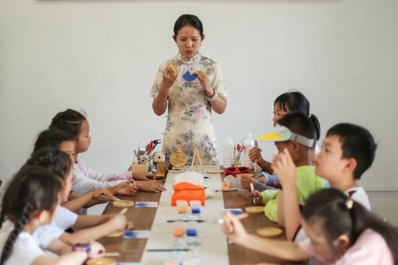 老師帶領(lǐng)小朋友現(xiàn)場(chǎng)體驗(yàn)掐絲琺瑯和水拓團(tuán)扇非遺技藝。孩子們認(rèn)真地完成掐絲、點(diǎn)藍(lán)等步驟,用顏料勾勒出美麗的圖案,不僅體驗(yàn)了手工制作的樂(lè)趣,也對(duì)非遺技藝有了更直觀的認(rèn)識(shí)。