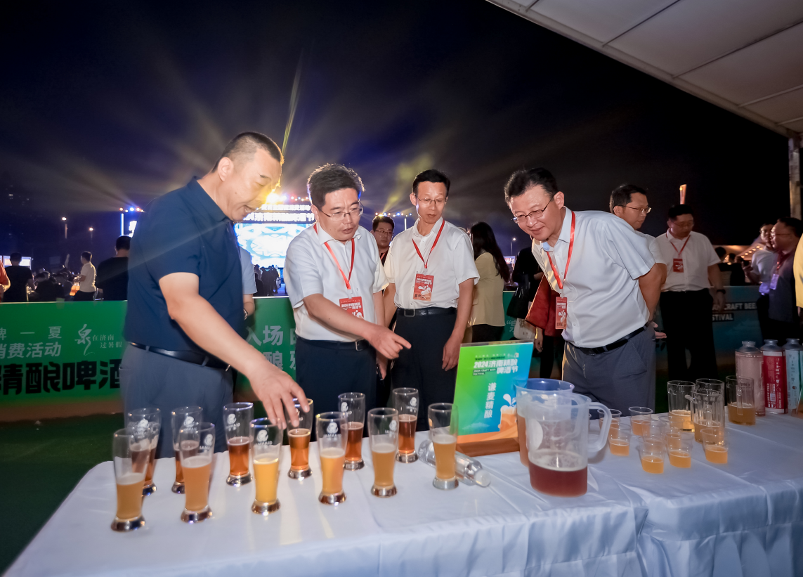 開幕式上,濟(jì)南市委宣傳部分管日常工作副部長、市文明辦主任孫世會和槐蔭區(qū)委書記孫常建開啟第一桶酒,并與濟(jì)南市人民政府辦公廳副主任譚征,濟(jì)南廣播電視臺黨委書記、臺長丁曉紅,濟(jì)南市商務(wù)局黨組副書記、副局長王志剛,濟(jì)南城市建設(shè)集團(tuán)副總經(jīng)理楊曉東,山東國際會展集團(tuán)負(fù)責(zé)同志,山東喜啤士精釀品牌運營管理有限公司負(fù)責(zé)同志共同舉杯發(fā)出誠摯邀請,歡迎四海賓朋“泉”在濟(jì)南過暑假,為期一個月的“泉城購”夏日主題促消費活動暨2024濟(jì)南精釀啤酒節(jié)正式啟幕。