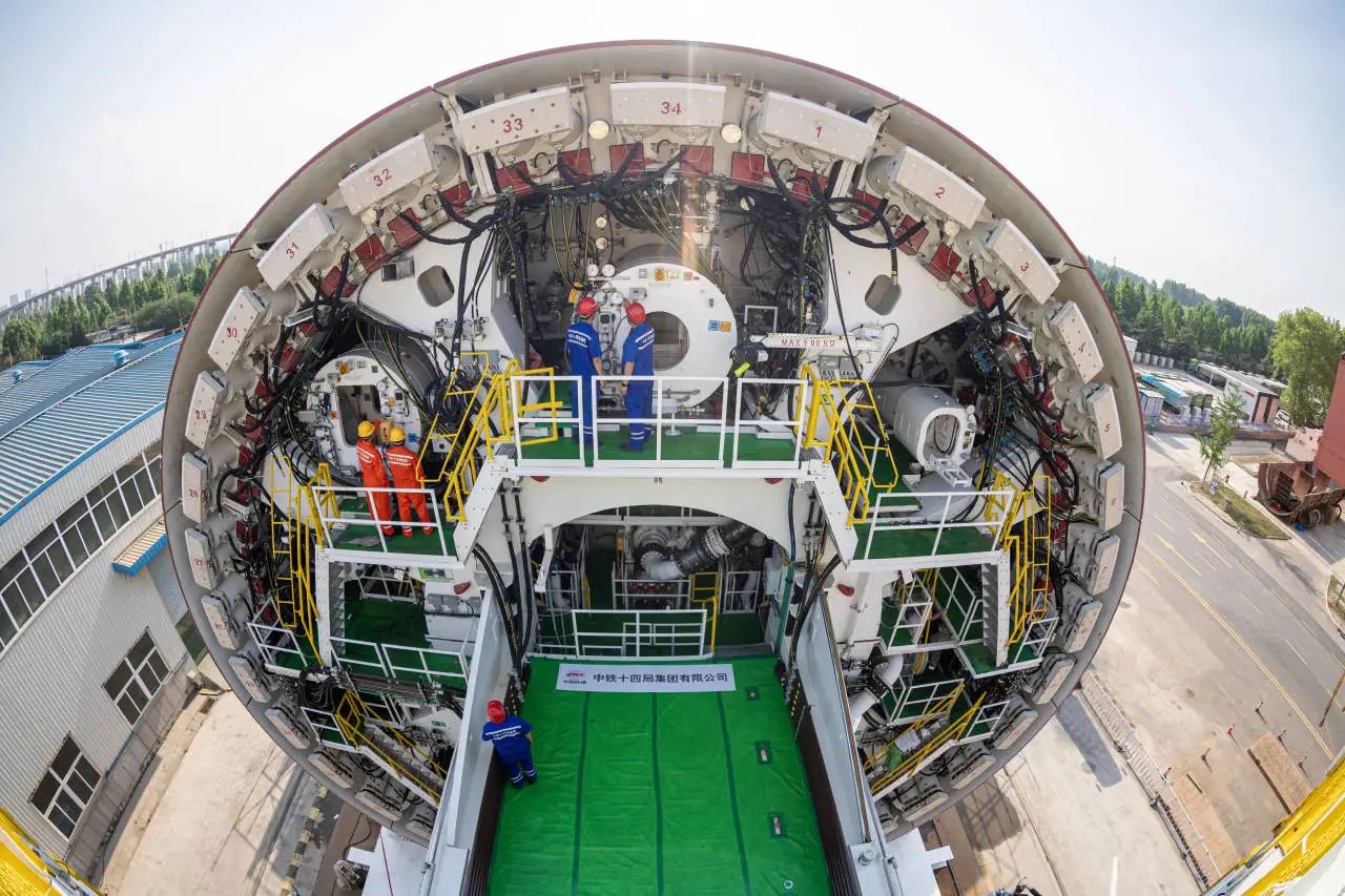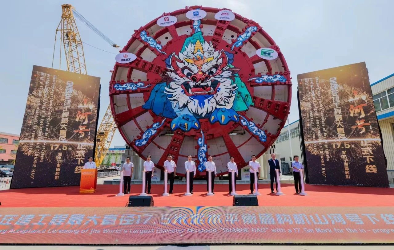 “山河號”泥水平衡盾構(gòu)機(jī)由濟(jì)南重工集團(tuán)、海瑞克集團(tuán)聯(lián)合濟(jì)南城市建設(shè)集團(tuán)、中鐵十四局集團(tuán)研發(fā)制造,最大開挖直徑17.5米,盾構(gòu)機(jī)總長163米、重約5200噸、裝機(jī)總功率12580千瓦;配備各類型開挖刀具共計306把,其中57把具備滾齒互換功能,以優(yōu)化其在多變地層中的作業(yè)性能;裝配帶壓復(fù)合型刀盤、伸縮式主驅(qū)動、泥水倉伸縮攝像頭;搭載刀盤磨損自動監(jiān)測、設(shè)備狀態(tài)在線監(jiān)測和“五官一腦”智能化裝備系統(tǒng),并通過大盾構(gòu)云智慧平臺實現(xiàn)遠(yuǎn)程操控,以保證掘進(jìn)安全和效率。
