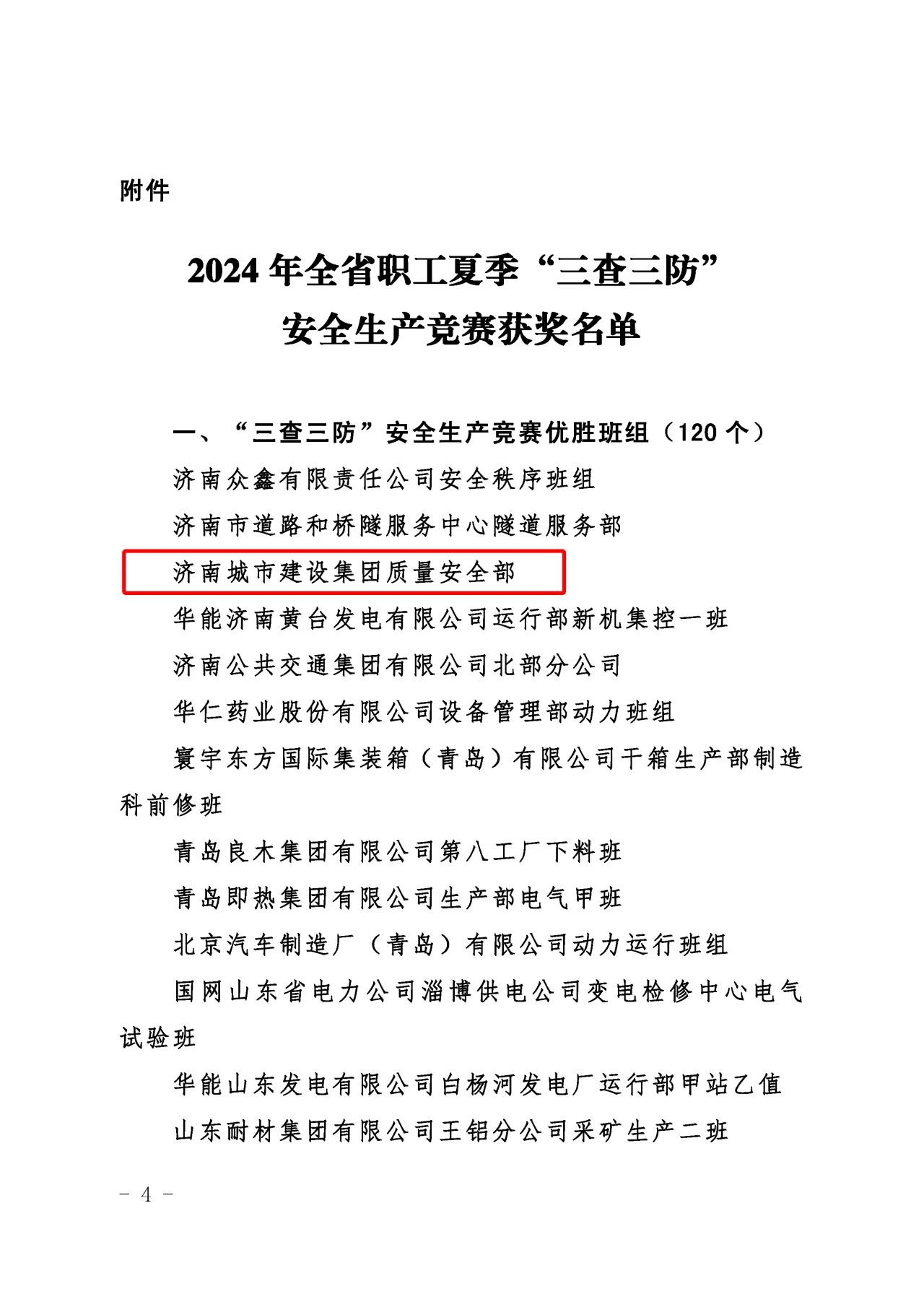 近日,山東省總工會、山東省應(yīng)急管理廳、山東省工業(yè)和信息化廳、山東省住房和城鄉(xiāng)建設(shè)廳、山東省交通運輸廳聯(lián)合發(fā)布了《關(guān)于公布2024年全省職工夏季“三查三防”安全生產(chǎn)競賽獲獎情況的通知》,濟南城市建設(shè)集團質(zhì)量安全部積極響應(yīng)上級主管部門的號召,按照集團黨委的科學(xué)部署,全面而深入地開展了各項安全專題活動,榮獲“三查三防”安全生產(chǎn)競賽優(yōu)勝班組榮譽稱號。