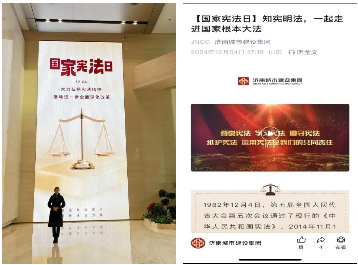 城建集團(tuán)公司通過懸掛條幅、組織觀看“憲法的精神 法治的力量——2024年度法治人物”專題節(jié)目等活動(dòng),激發(fā)了員工學(xué)習(xí)憲法的熱情,促使大家主動(dòng)深入了解憲法,營造良好的普法氛圍。通過開展憲法宣傳周活動(dòng),員工法治觀念顯著增強(qiáng),在公司內(nèi)部營造出尊崇憲法、學(xué)習(xí)憲法、遵守憲法、維護(hù)憲法、運(yùn)用憲法的良好氛圍,為公司健康穩(wěn)定發(fā)展筑牢了法治根基。