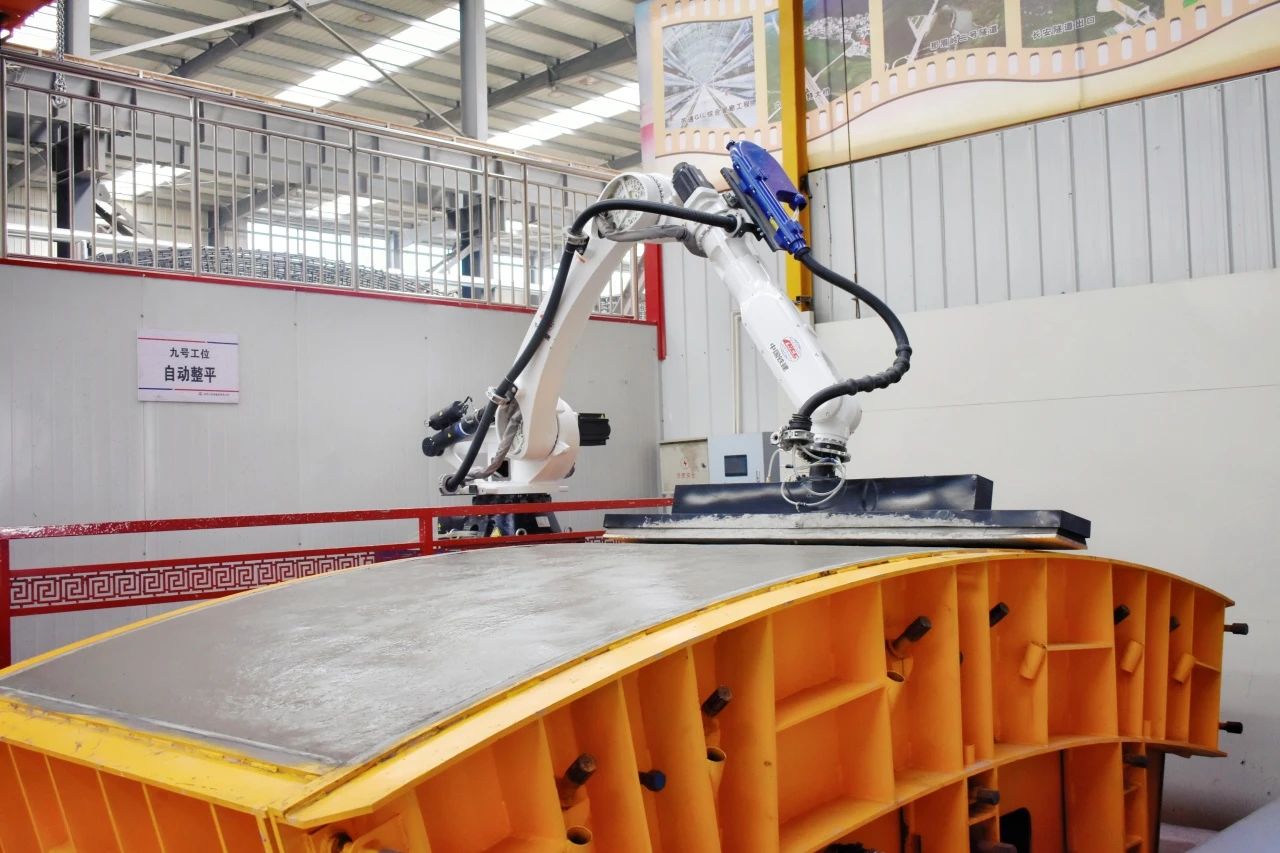 項目使用第五代超大直徑盾構管片綠色智能生產(chǎn)線,設置1條灌注線、3條養(yǎng)護線,實現(xiàn)了20余項關鍵技術革新,搭載清模、噴涂、收面、運載、管片掃描、鋼筋籠掃描等6種智能機器人,實現(xiàn)生產(chǎn)自動化、少人化,不僅減少了人工操作誤差,降低了安全風險,而且提高了作業(yè)效率,節(jié)約了生產(chǎn)成本。3套管片模型實現(xiàn)每天7環(huán)的產(chǎn)能,每日發(fā)運數(shù)量最高可達11環(huán),其中發(fā)明螺旋筋固定裝置,投入使用后將合格率提升到99%;發(fā)明管片內(nèi)、外弧面鋼板定位裝置,實施后預埋鋼板一次成型合格率提升16.6%,有效提高生產(chǎn)效率,減少材料浪費。