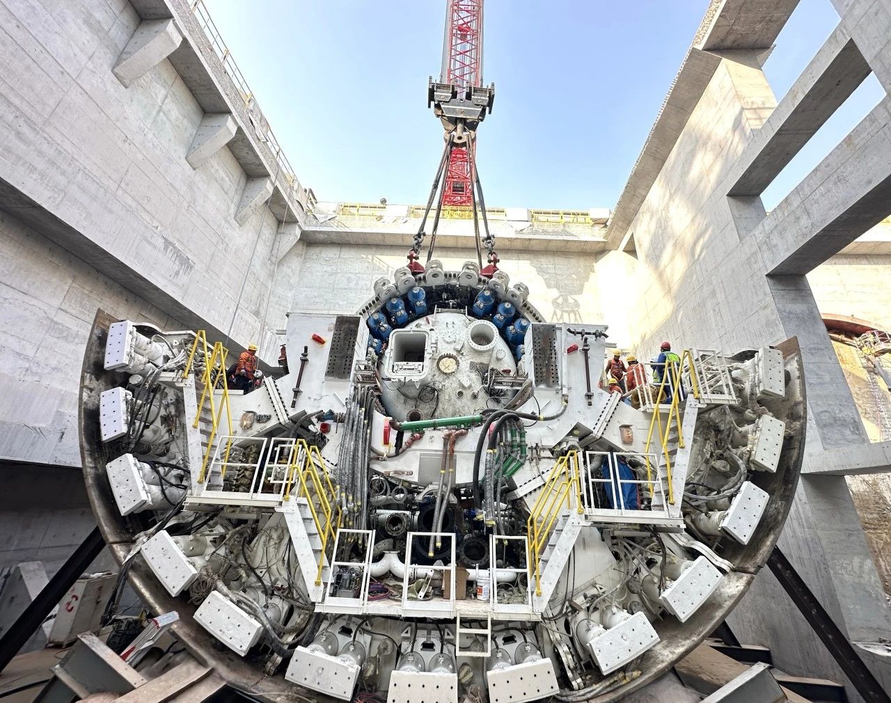 為了確保主驅(qū)動(dòng)順利下井,項(xiàng)目團(tuán)隊(duì)科學(xué)部署、超前謀劃,多次研究施工現(xiàn)場,詳細(xì)制定主驅(qū)動(dòng)吊裝下井方案,確保周圍環(huán)境符合施工要求。當(dāng)天上午,隨著指令下達(dá),800噸履帶吊將主驅(qū)動(dòng)平穩(wěn)吊起,在空中經(jīng)歷了起吊、翻身、旋轉(zhuǎn)等一系列高難度動(dòng)作后,經(jīng)過現(xiàn)場一點(diǎn)點(diǎn)調(diào)整方位后,緩緩送入始發(fā)井內(nèi),成功與井下盾體結(jié)合。