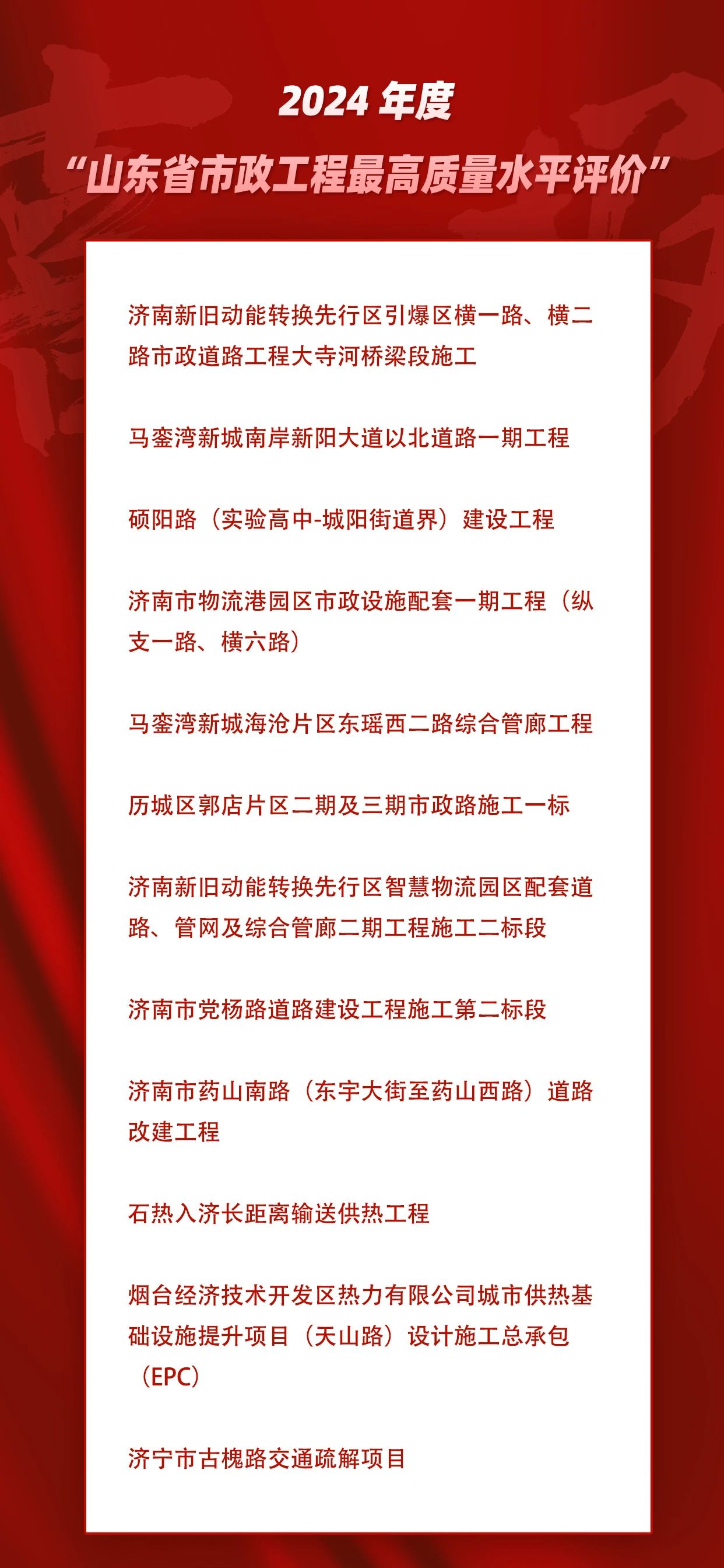 近日,山東省市政行業(yè)協(xié)會發(fā)布了《關(guān)于公布2024年度通過市政工程最高質(zhì)量水平評價工程的通知》,建設(shè)集團(tuán)及其所屬子公司參與的12項(xiàng)工程獲評2024年度山東省市政工程最高質(zhì)量水平評價。