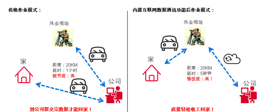 打破傳統(tǒng)城市測量模式必須回到公司才能進行數(shù)據(jù)傳輸?shù)亩ň?,新一代TZ系列全站儀能夠隨時隨地的實現(xiàn)數(shù)據(jù)成果分享,測量結(jié)束后直接收工回家,大大降低工作強度,感受更加愉悅、輕松的測量體驗!
